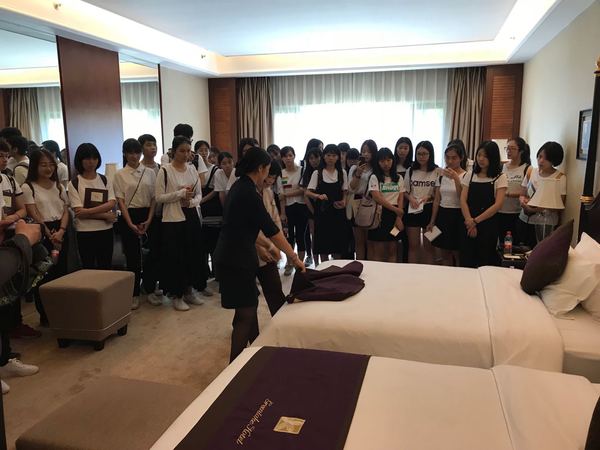 张慧丽经理带领各位师生先后参观酒店大堂、客房、康乐、餐饮等区域并进行了详细的介绍。在参观客房、餐饮区域时,为使各位同学更加直观深入的了解客房、餐饮工作的基本流程与具体细节,酒店专业人士进行了现场展示和专业讲解,并指出作为酒店管理专业同学在从事这一行业时应知应会的基本技能。
