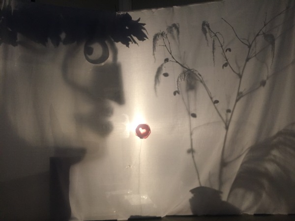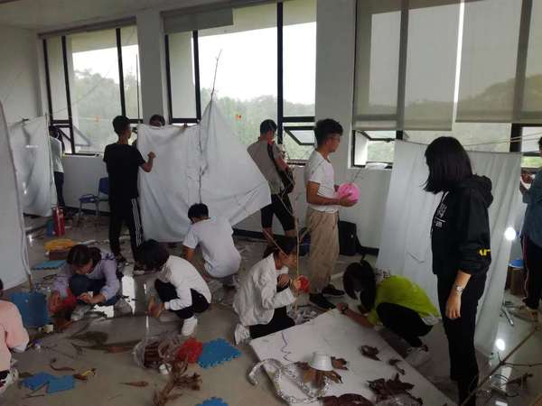片刻的迷茫之后,同学们便开始了行动,走遍校区的各个角落,收集起各种所要的物资:河边的芦苇,地上的石头,路边的树叶……待物资堆起,便是创作的时刻。同学们的工作从凌乱逐步走向有序,他们用线拉起一片片树叶,组成肖像的五官,捆起一支支芦苇扎成肖像的长长青丝,拿起台灯,打起光影,在幕布上印下自己努力下的杰作。