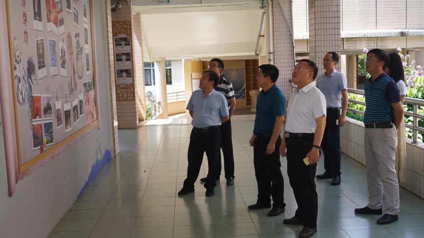 苏年福副局长,王青副院长和朱虹霖老师在龙江中学领导的陪同下参观日语文化长廊