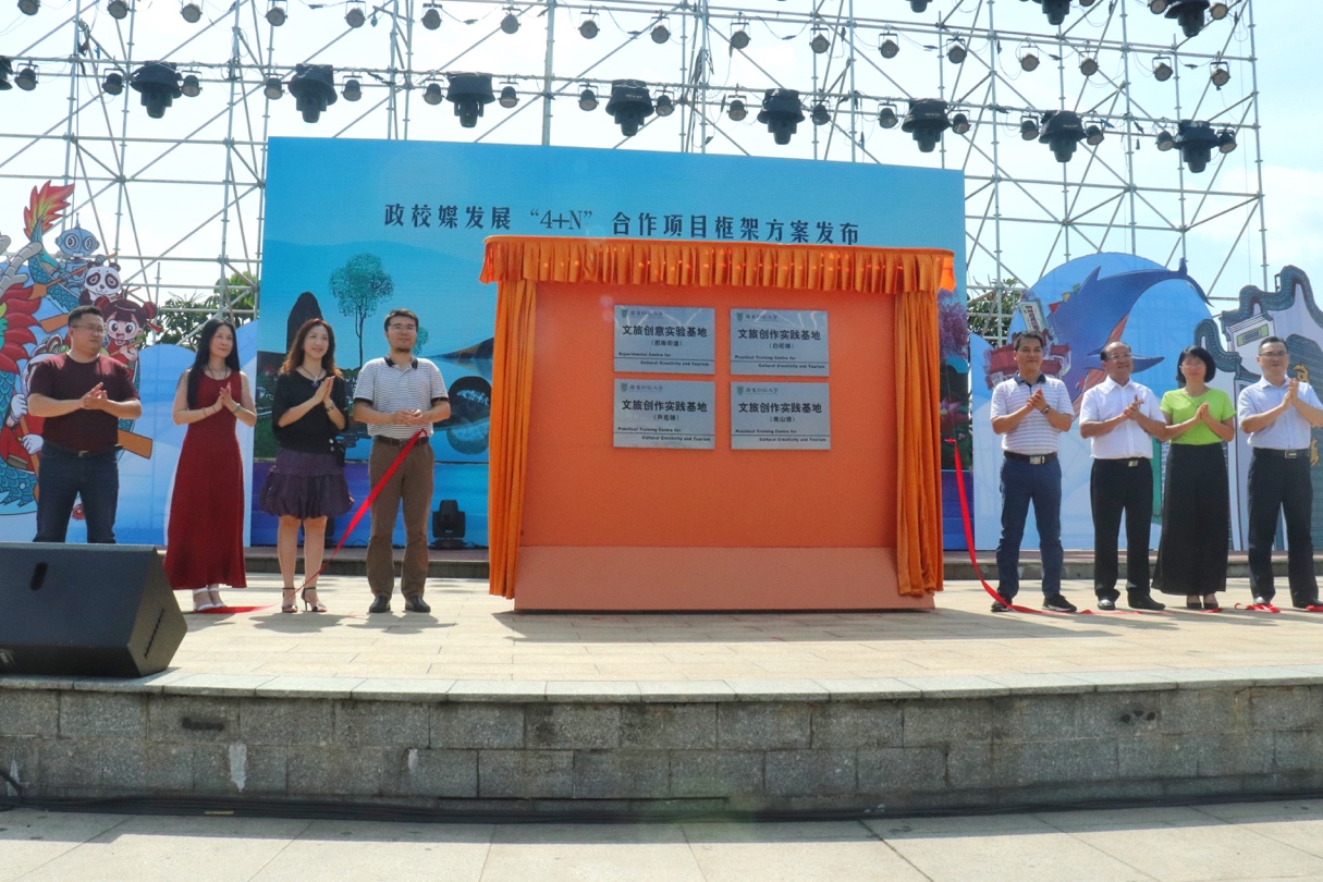 近日,在2019三水区旅游文化周启动仪式上,政校媒合作模式暨“4+N”合作项目框架方案正式对外发布。william威廉中文官网文化创意与旅游学院院长贾毅,三水区委宣传部副部长、区文广旅体局副局区艳阳,以及佛山电台,广州日报、西南街道、白坭镇、芦苞镇、南山镇等相关负责人分别上台进行了校政媒发展“4+N”合作项目框架方案发布和共建基地揭牌。