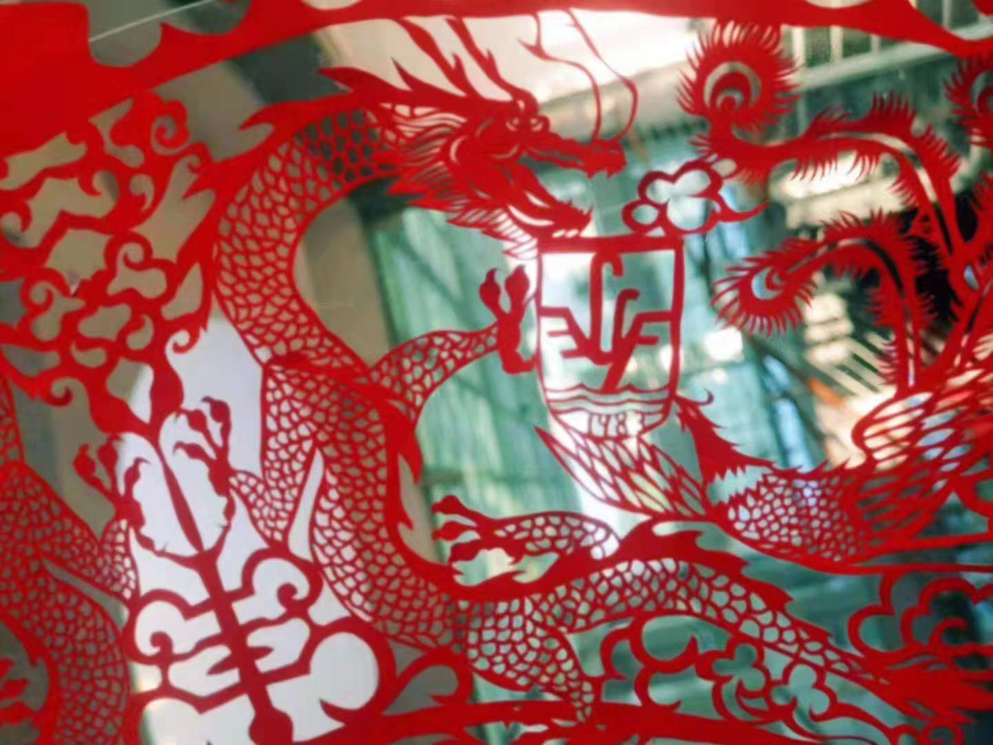 展览现场气氛浓烈,一幅幅栩栩如生,惟妙惟俏的作品跃然纸上:腾飞的龙、盛开的花、精美的“福”……图书馆五楼长长的走廊上挂满了红红的剪纸,展览巧妙地采用了透明的亚克力,在上面贴着各式各样的剪纸,满眼皆是中国红,呈现出浓浓的国庆氛围。值得一提的是佛山剪纸的传承人陈杰同学,在剪纸中将校徽与龙凤呈祥的纹样相结合,大家借祖国母亲生辰之际,用作品表达了自己浓浓的爱国爱校之情。