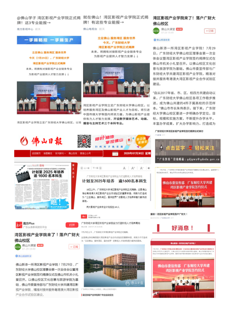 湾区影视产业学院揭牌受到了多家媒体的关注,包括学习强国、南方+、广东教育、佛山日报、佛山电视台、佛山+等多家新闻媒体报道,湾区影视产业学院的建设理念和影响力得到各方的认同,将对产业学院今后的发展和佛山以及粤港澳大湾区影视人才培养起到积极的推动作用。