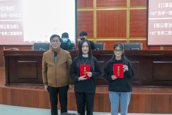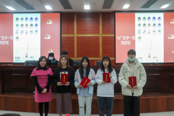 紧接着进入到颁奖环节。获二等奖的同学简梅芳、李杭芷上台分享作品和心得;获三等奖的张雄辉、郑舒瑶等四名同学与老师合影留念。