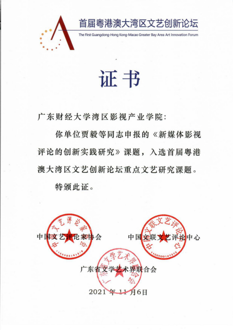 11月6日上午,“首届粤港澳大湾区文艺创新论坛”在广东中山举行。我校湾区影视产业学院报送的《新媒体影视评论的创新实践研究》经过层层角逐,入选重点文艺研究课题。