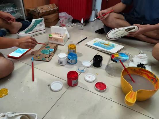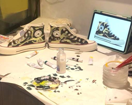 李同学:我认为这次的活动给了我和以往传统课堂上不一样的体会,我第一次在鞋子上进行创作,这途中虽然挫折不断,从最开始拿到鞋子不知道如何下手,到后面无法画出预期的效果,创作过程感觉到了很多困难,但是等真正完成自己的作品后,真的成就感满满!原来我们生活中普通的小白鞋也可以这么有趣!这个课程作业也使得我的专业能力有了极大的提升。