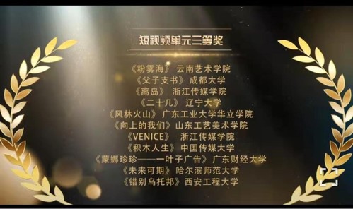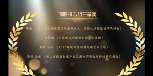 年会当晚,中国高校影视学会2020-2021年度学术成果、影视作品推优活动暨第十四届“学会奖”、第十届“学院奖”在云端揭晓。我院师生作品共摘得1个二等奖、3个三等奖。包括贾毅教授、张乐副教授主持完成的《佛山市促进影视产业发展专项资金可行性研究报告》获调研报告组三等奖,我院为三水量身打造的首部文旅宣传片《寻境三水》获得短视频单元教师组二等奖,广播剧《驰援武汉的日子》获教师组声音单元三等奖,19级数字媒体艺术专业学生冯洁莹、吴梦瑶、李家瑜、欧晓钰创作的《蒙娜珍珍——一叶子广告》获得学生组短视频三等奖。这是学院成立以来第一次多个作品参与中国高校影视学会“学会奖”“学院奖”的评选,表现亮眼。