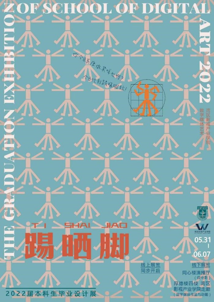 本次展览以“踢晒脚”命名,借助这句广东白话厘语,诙谐地形容“忙到不可开交”,展现了数字媒体艺术专业师生为筹备毕业展忙碌而努力的真实状态。展览分为两个展区,厚德楼四楼湾区影视产业学院文化长廊展示互动装置与服务设计类作品,同心楼演播室展示数字影像作品。在视频作品中,着重情感与关系的描述,刻画出当代青年对个体架构于社会中的反思和挑战;在动画作品中,同学们经由创作进行身份的思考,讨论诸如性别与移动的经验;在服务设计与文创类作品中,则展示了同学们对于设计问题的掌握与解决方针设计的能力。