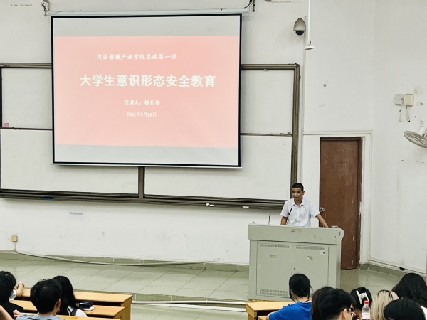9月26日,湾区影视产业学院党委书记杨长春在佛山校区励学楼208课室为我院22级全体新生开讲“大学生意识形态安全教育”思政第一课。