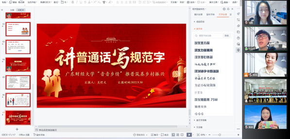 “音音乡情——推普筑基乡村文化振兴”项目入选2022教育部“推普助力乡村振兴”全国大学生暑期社会实践志愿服务活动国家级团队和广东省团队。除了本次云课堂活动,团队还为佛山援疆工作队编著的《图说三字经》录制了普通话示范音频,以有声书的形式助力优秀传统文化传播。