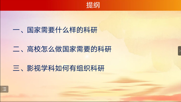讲座第一部分,厉震林教授提出做科研应该要立足时代性、传统文化等背景,必须了解国家需要什么样的科研,讲述了要做有组织科研的原因,解读了什么是有组织科研,以及怎么做有组织科研。第二部分,厉教授向师生们介绍了高校应当怎么做国家需要的科研,包括研究真问题、真研究问题、解决实际问题,开展真合作、推动真改革、营造健康的学术生态,以及学校怎么抓有组织科研。第三部分,厉教授分享了影视学科如何开展有组织科研,目标是应解决影视领域重大瓶颈问题。