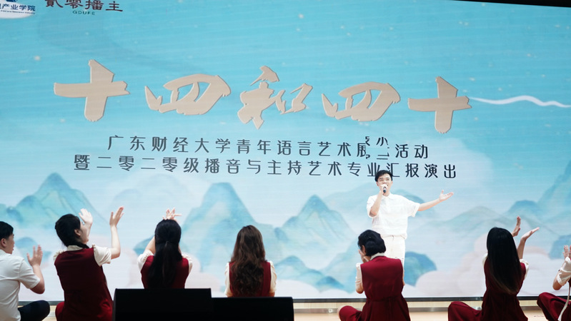 汇报演出在2020级播音与主持艺术专业历年优秀毕业生祝福视频、自媒体视频集锦、个人风采短片中拉开帷幕。《新闻聚焦》节目用新闻播报、新闻评论的形式,彰显大湾区建设发展进程;《音音乡情》以三个大学生志愿团队故事为主线,展现广财学子在社会实践、志愿服务项目中取得的累累硕果;《广财青年志》带领观众与我校13级优秀毕业生、扎根西藏的大学生村官黄海芬展开一段跨越时空的相遇;《播音争功》《奇妙的朋友》则采用情景短剧的表演形式,将专业技巧展示与幽默风趣的语言相结合,聚焦社会热点与当代青年生活;《诗情画意舞翩迁》更是创新性地将古画、古典舞与节目主持相结合,展示出了同学们的多才多艺和创意思维,引得场下叫好连连、掌声不断。演出尾声,全班同学身着整齐的班服,激情朗诵为校庆四十周年创作的诗歌《奋斗四十载、青春再出发》,将汇演推向高潮。