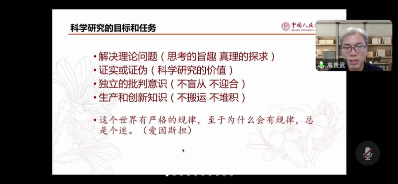 9月5日,提前培养讲座聚焦研究生学术研究的目标与路径,中国人民大学高贵武教授线上开讲。高贵武教授结合自身研究与从教的经历,与学生分享了他对于学术研究的理解和认识,全面剖析了学者的社会定位、科学研究的目标和任务,以及学术研究的路径与方法。