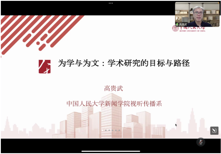 9月5日,提前培养讲座聚焦研究生学术研究的目标与路径,中国人民大学高贵武教授线上开讲。高贵武教授结合自身研究与从教的经历,与学生分享了他对于学术研究的理解和认识,全面剖析了学者的社会定位、科学研究的目标和任务,以及学术研究的路径与方法。