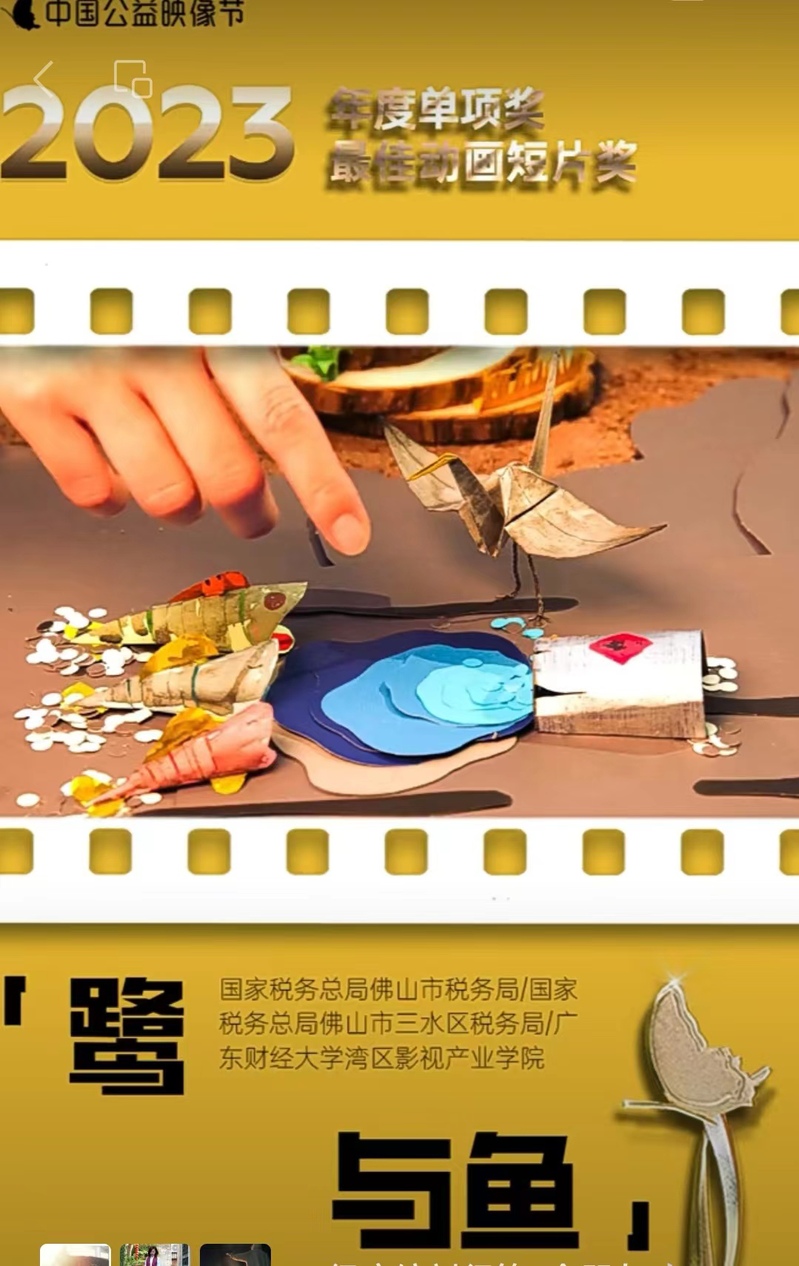 9月16日,2023中国公益映像节颁奖典礼及主题论坛在深圳举行,william威廉中文官网湾区影视产业学院与国家税务总局佛山市税务国家税务总局佛山市三水区税务局联合创作的原创动画短片作品《鹭与鱼》600余部短片中脱颖而出,荣获“年度最佳动画短片奖”。