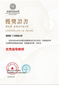 此外,在龚思颖老师的指导下,李熙蕾、林春辰、张晓萱同学在2023国青杯全国高校艺术设计大赛”中获得二等奖;在“第五届HKCDA香港当代设计奖”中获得铜奖;在“第二届华夏奖·海峡两岸非遗创意设计大赛”中获得优秀奖;在“2023北京非物质文化遗产时尚创意设计大赛”中获得优秀奖。同时,龚思颖老师指导孙畅、董婷婷、彭玲玲、钟颖彤同学在“KTK靳埭强设计奖2023全球华人设计比赛”中获得优秀奖。