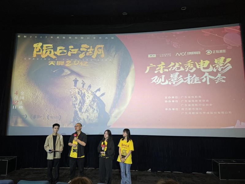49日下午,湾区影视产业学院研究生在广州塔金逸空中影城参加了由广东省电影局主办的广东优秀电影《陨石江湖:天降20亿》观影推介会。此次活动由徐嘉徽老师带队,是研究生教学模式的新探索,也是《影视产业概论》和《湾区影视产业专题》两门课程的实践教学环节。