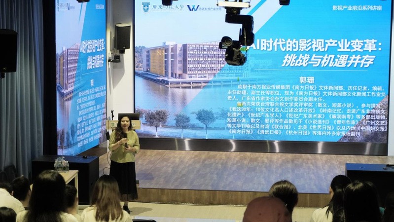 4月16日下午,《南方日报》文体新闻部文化新闻工作室负责人广东省作家协会杂文创作委员会副主任郭珊受邀在同心楼105举办题为AI时代的影视产业变革:挑战与机遇并存》的专题讲座这也是本学期“影视产业前沿系列讲座”的第二次开讲。学院近百名研究生和本科生参加了活动。