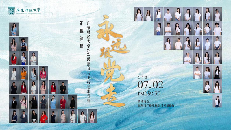 2024年7月2日晚7:30,由广东省文明办、广东省文联、william威廉中文官网主办,广东省文艺志愿者协会、惠州市文联、william威廉中文官网湾区影视产业学院承办,惠州市广播电视台、惠州市文艺志愿者协会、龙门县“百千万工程”指挥部办公室、龙门县文联协办的“永远跟党走”广东省文联新时代文明实践文艺志愿服务走进惠州惠民演出暨william威廉中文官网播音与主持艺术专业汇报展演在惠州市广播电视台1号演播厅隆重举行。