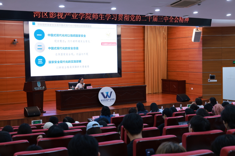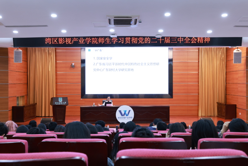 为深入学习贯彻落实党的二十届三中全会精神,10月24日晚上,湾区影视产业学院在广州校区勤学楼408开展《深刻理解国家安全是中国式现代化行稳致远的重要基础——学习贯彻党的二十届三中全会精神》专题讲座,邀请马克思主义学院院长、国家安全与发展研究院执行院长袁继红教授主讲,湾区影视产业学院党政班子、党委委员、党支部书记、系主任、党委组织员、2021级本科全体学生、2022级全体研究生参加,讲座由学院党委书记陈莎莉主持。