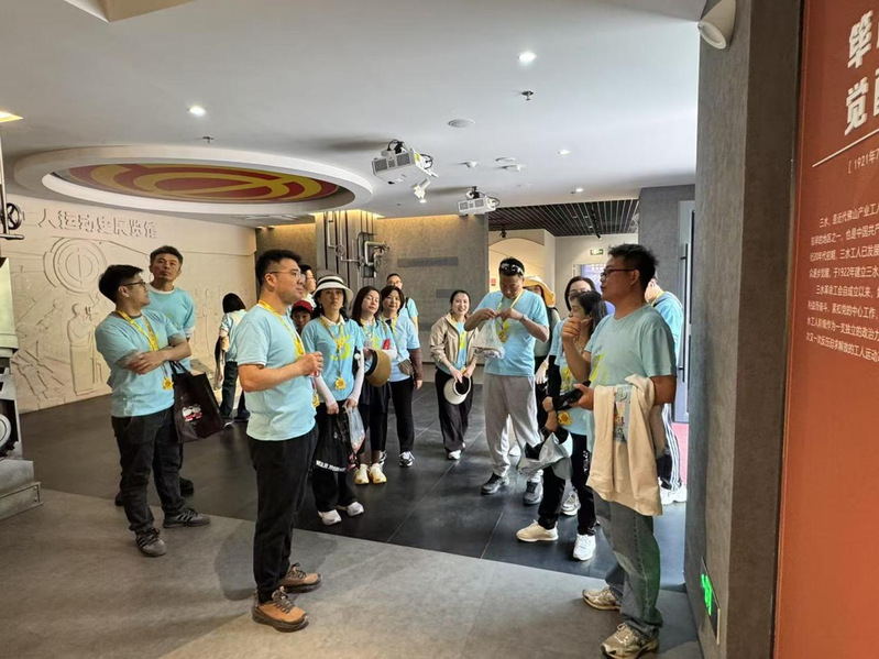 沉浸工运历史课堂,厚植红色文化基因。徒步活动结束后,第一支部前往三水工人文化宫工运展览馆开展专题学习。该馆以三水百年工运史为主线,通过珍贵文物、影像资料和互动场景再现工人阶级奋斗历程。值得一提的是,支部党员曾严彬发挥专业优势,全程参与展览策划及主题视频制作,将影视艺术与红色教育深度融合。通过梳理三水工人参与抗日救亡、支援改革开放等史料,曾老师也深刻体会到工人阶级的先锋力量。而作为高校教师,更应立足专业讲好中国故事。党员们通过沉浸式参观,重温党领导工人运动的辉煌篇章,强化了为党育人、为国育才的使命意识。