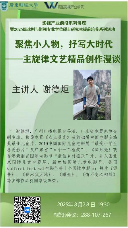 8月28日晚,湾区影视产业学院举办2025级戏剧与影视专业学位硕士研究生提前培养系列讲座第二讲《聚焦小人物,抒写大时代——主旋律文艺精品创作漫谈》。学院研究生及青年教师等80余人参与活动,共同探讨主旋律文艺创作中“以小见大”的创作逻辑与实践路径。