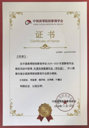 短片《狗事》描绘了一个男孩与流浪狗的纯粹情感,被成人世界的功利理性所扼杀的故事。他追寻“伊甸园”的幻梦,象征着童真理想在现实中的破灭。作品在创意表达与技术呈现方面获得好评,在中国高等院校影视学会2024-2025年度影视作品推优活动中,获得“年度优秀数媒作品(学生组)”,并入围现场展映单元。