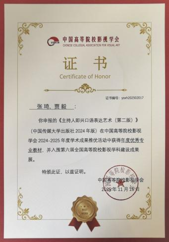 张琦、贾毅教授编著的教材《主持人即兴口语表达艺术(第二版)》在中国高等院校影视学会2024-2025年度学术成果推优活动中,荣获“年度优秀专业教材”,并入围第六届全国高等院校影视学科建设成果展。