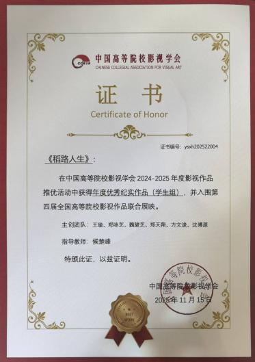 纪录片《稻路人生》依托2024年冬季GREAT湾区青年影视训练营走进惠州龙门创作完成,也是内地与粤港澳三地青年的联合作品。它真实记录了一位放下教鞭,帮扶留守儿童、老人、返乡青年,守护家乡稻田的女企业家的奋斗故事,在中国高校影视学会2024-2025年度影视作品推优活动中,获得“年度优秀纪实作品(学生组)”。