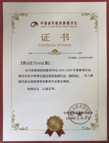 文旅短视频《佛山这Young看》,通过镜头走进佛山三位年轻掌门人,看他们结合时代特色、深耕自身领域,以青春为墨,共同绘就佛山生动的不同“样”/“young”,生动诠释了奋斗是青春最美的旋律,在中国高校影视学会2024-2025年度影视作品推优活动中,获得“年度优秀短视频作品(教师组)”。
