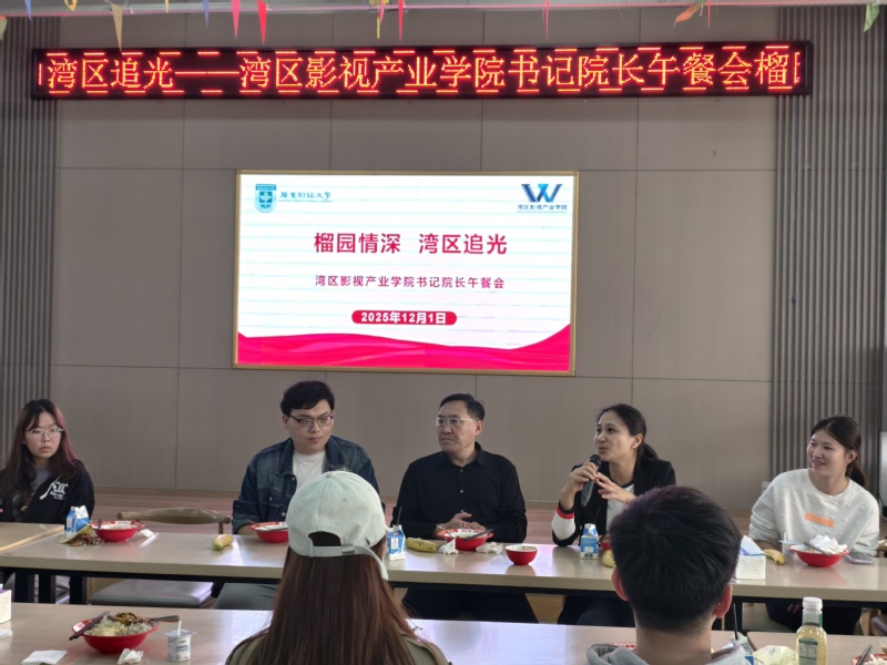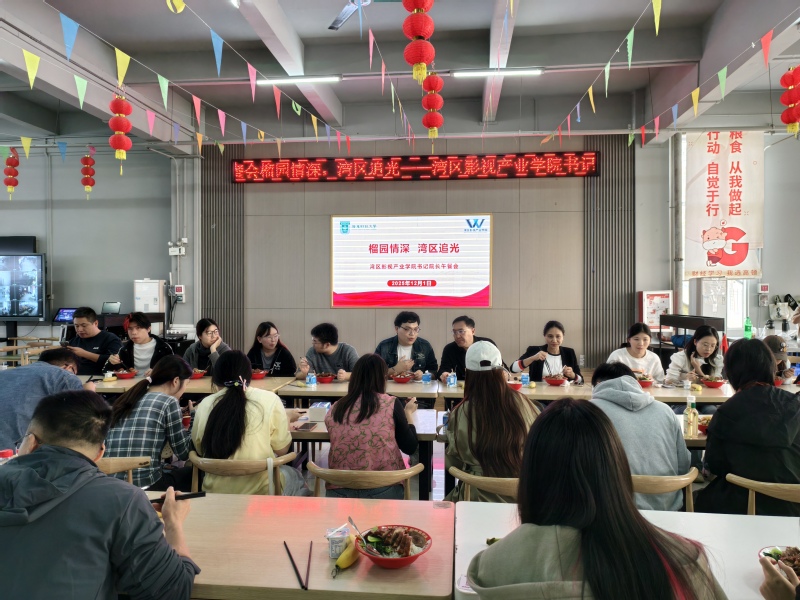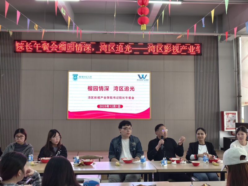 12月1日中午,湾区影视产业学院在佛山校区第三饭堂一楼举办“榴园情深 湾区追光”书记院长午餐会。学院党委书记陈蓉、院长贾毅、副书记路军奉、副院长张琦、董超、辅导员与本科、研究生代表齐聚一堂,佛山校区工作部部长刘大鹏、副部长杨昊、综合办主任陆万权受邀参加。在轻松融洽的氛围中,师生面对面共话校园发展良策,共解成长成才困惑。